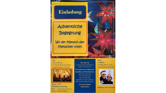 Am vierten Advent laden Carla und Wolfang Hertel mit ihrem Helferteam herzlich zu einer adventlichen Begegnung mit gemeinsamem Mittagessen, Kaffee und Kuchen ein. Wir wollen Sie als Menschen begrüßen und kennenlernen, egal, ob Sie alleine oder mit Familie kommen, egal wie alt Sie sind, egal, ob Sie arm oder reich sind, egal, welchen Glauben Sie haben. Sie sind herzlich willkommen.
