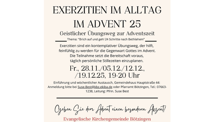 Die evangelische Kirchengemeinde Bötzingen lädt in der Adventszeit ein zu Exerzitien im Alltag. Exerzitien sind ein Übungsweg, der hilft, feinfühlig zu werden für die Gegenwart Gottes im Advent. Die Adventszeit ist so oft hektisch und voll mit Terminen. Die Exerzitien schaffen Raum für tägliche Zeiten der Stille. Die Lebendigkeit des Glaubens und die Vorfreude auf das Geburtstagsfest unseres Heilandes rücken wieder mehr in den Fokus.