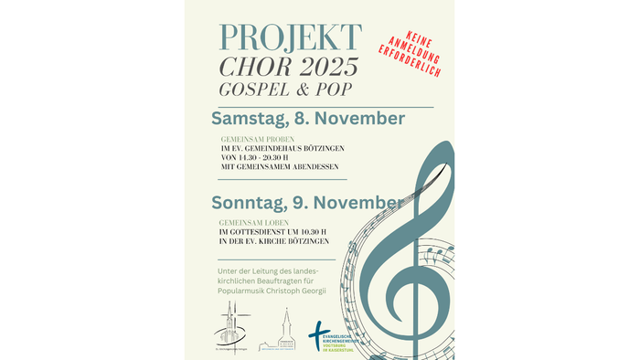 Am Wochenende des 8./9. November 2025 laden die Kirchengemeinden Bötzingen und Ihringen ein zu einem gemeinsamen Gospelprojekt mit gemeinsam gestaltetem Gottesdienst. Der landeskirchliche Popularmusiker Christoph Georgii führt uns durch verschiedene Stücke und gestaltet zusammen mit Pfarrerin Suse Best und dem Chor den Gottesdienst am Sonntag, 9. November, um 10:30 Uhr.