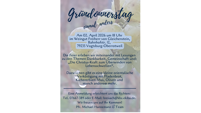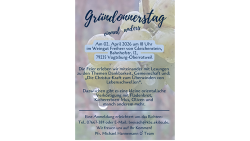 Eine Feier zum Gründonnerstag "einmal anders" erleben wir miteinander mit Lesungen zu den Themen Dankbarkeit, Gemeinschaft und: „Die Christus-Kraft zum Überwinden von Lebensschwellen“.