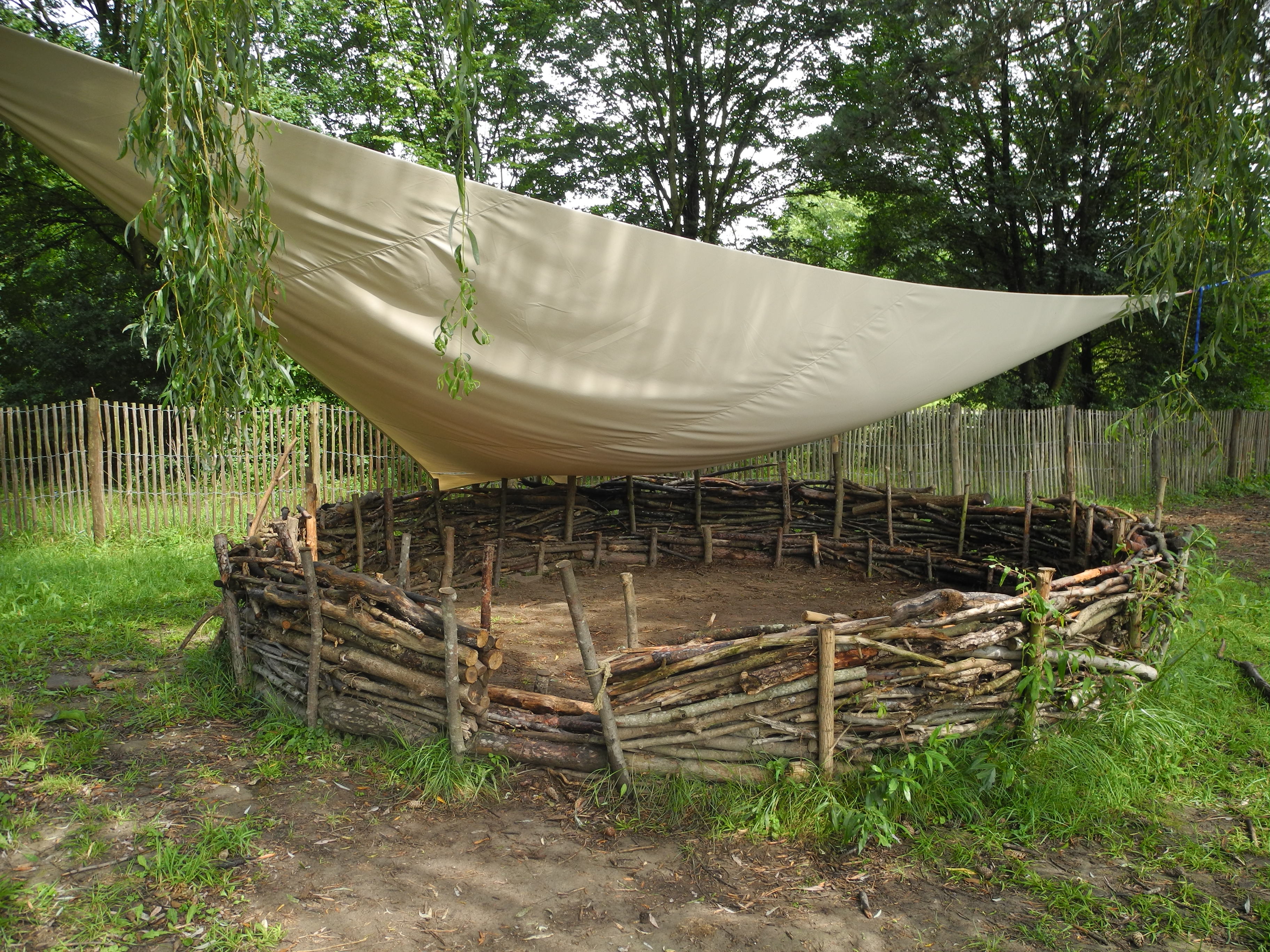 Mit Hilfe der Kinder ist auf unserem Gelände ein Waldsofa entstanden. Über mehrere Wochen haben wir Äste gesägt und kreisrund in die Erde geklopft. Danach haben wir es gefüllt bis wir eine Sitzfläche und eine Rückenlehne hatten.